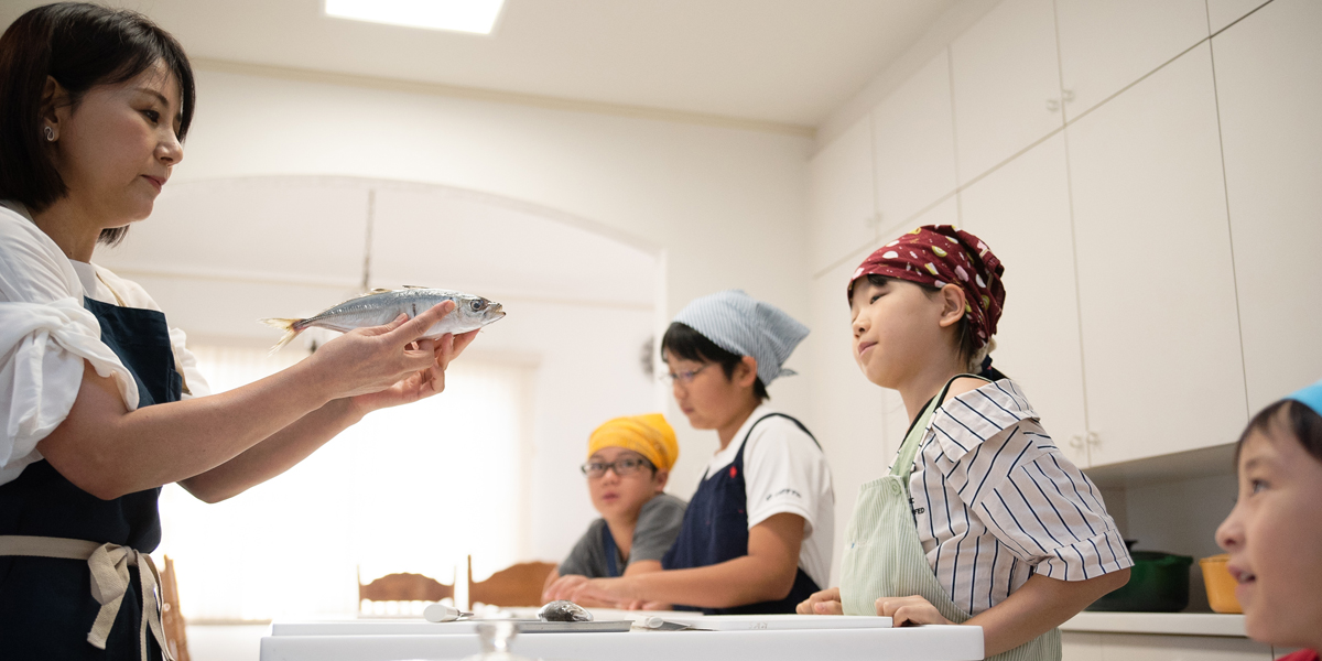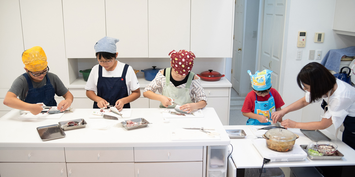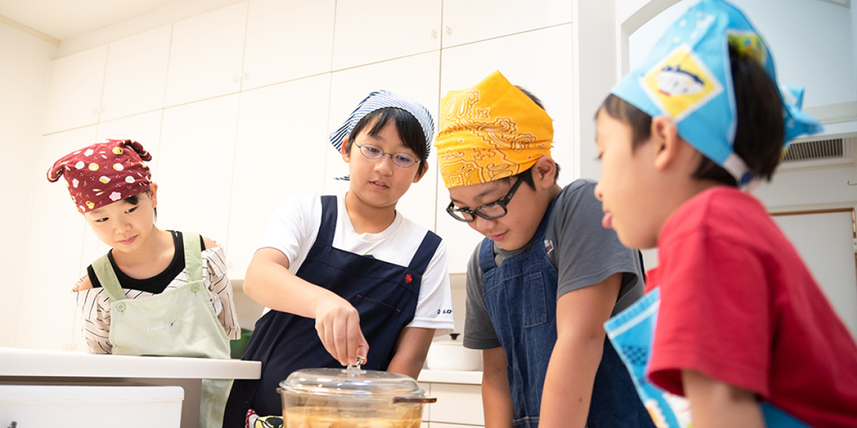 基礎体験を重視した「Hands on」の考え方をベースに、料理を通じて五感(視覚・聴覚・嗅覚・味覚・触覚)を使い、子ども自身が様々な発見・ 体験を積み重ね、体験食育として「生きる力」を育む場としています。